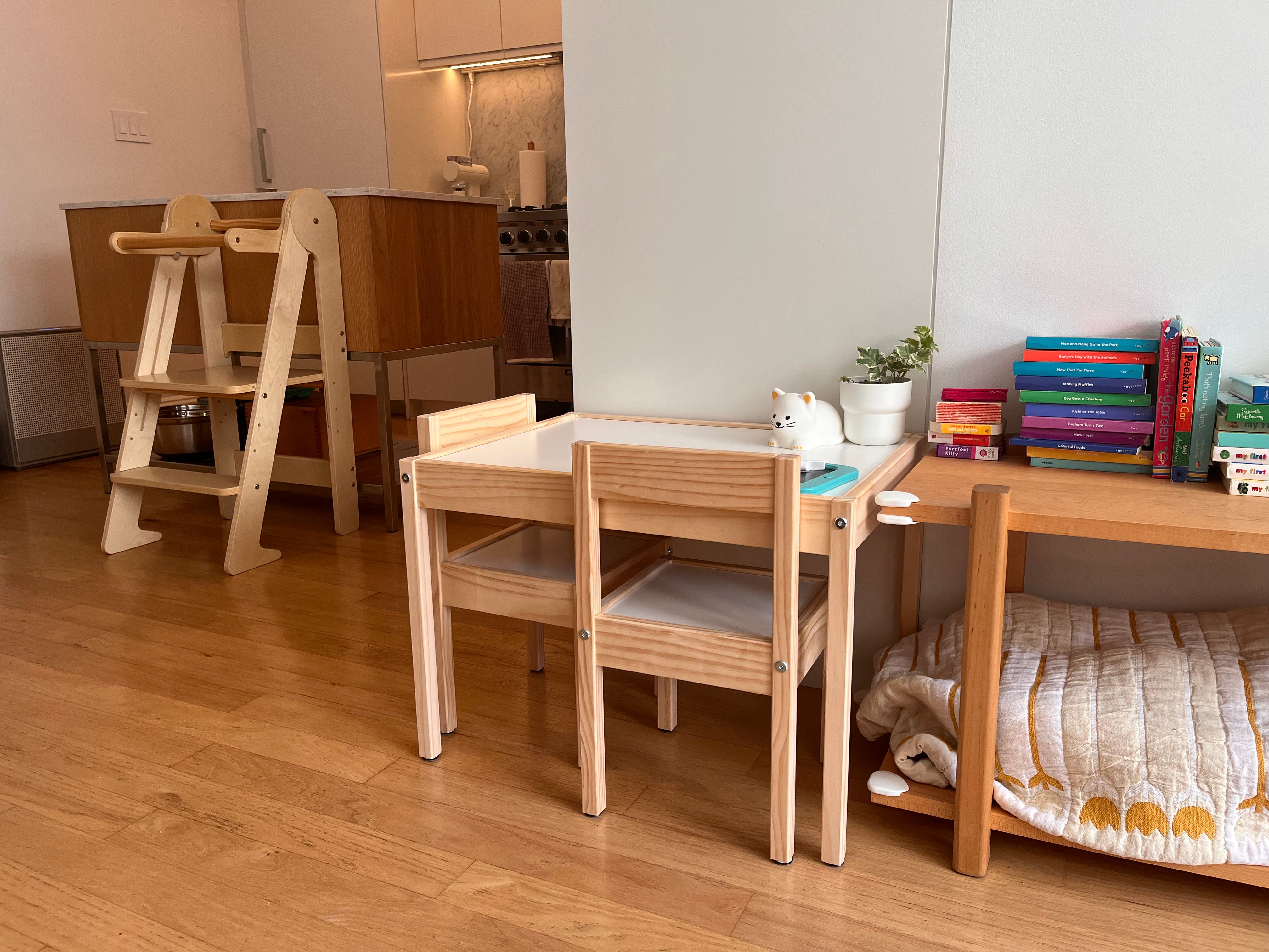 Buoyed by more time spent at home than we had initially planned for this summer, I’ve been busying myself during Esme’s naps on the weekend with cleaning and organizing so that we can give a bit more clarity and order to our home and also to create room for some Esme specific spaces. After re-homing some baby toys and shifting things around we’ve made space for Esme to have a place to get ready and access cleaning tools, a little practical kitchen (in our kitchen) and a little table where she can eat, draw and care for her plant.
