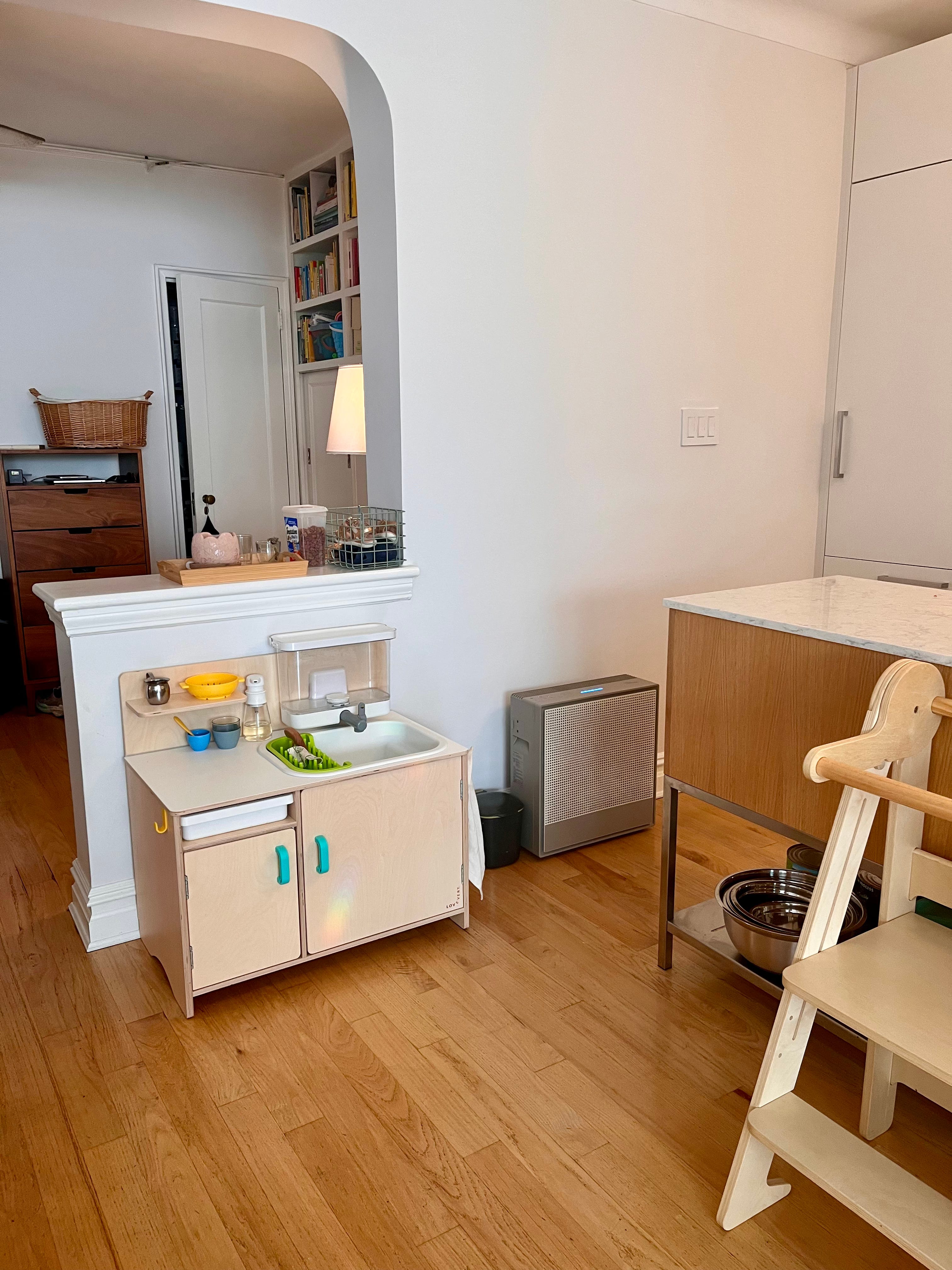 After months of hemming and hawing over how to hack an Ikea kitchen or some other piece of furniture into a small practical kitchen for Esme we ended up getting her a ready made kitchen from Lovevery. We all love it and find it incredibly charming. After adding some shelving into the cabinet, it’s a nice space for Esme to be able to store her own dishes and bowls. She loves to fetch and set her own table, fill her cup with water and grab a sponge to clean up spills. She’s still a bit short for the sink for hand and plate washing, but I feel confident she’ll grow into it soon.
